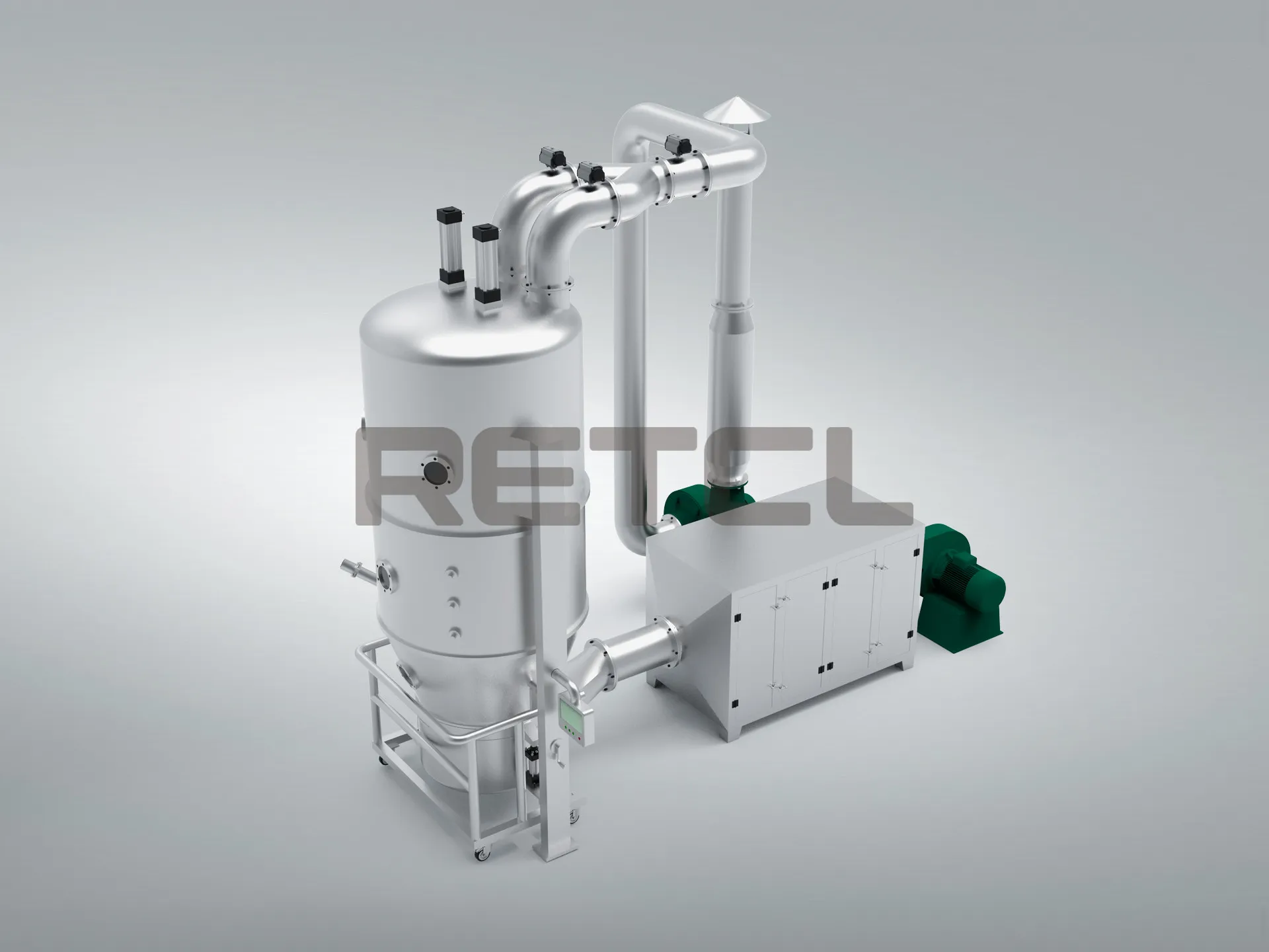 湿物料在机器内部被空气扰动形成流化床,空气与物料充分接触,因此在较短时间内就可以完成干燥或冷却。该机器仅用于批次生产,但相比卧式流化床干燥机高度可形成更高的流化床,常与湿法制粒机配套使用。